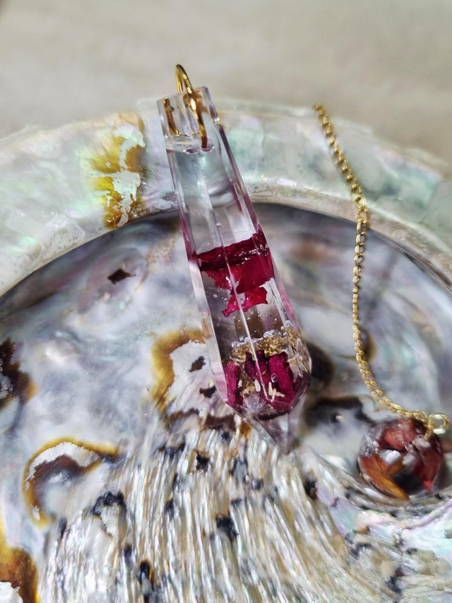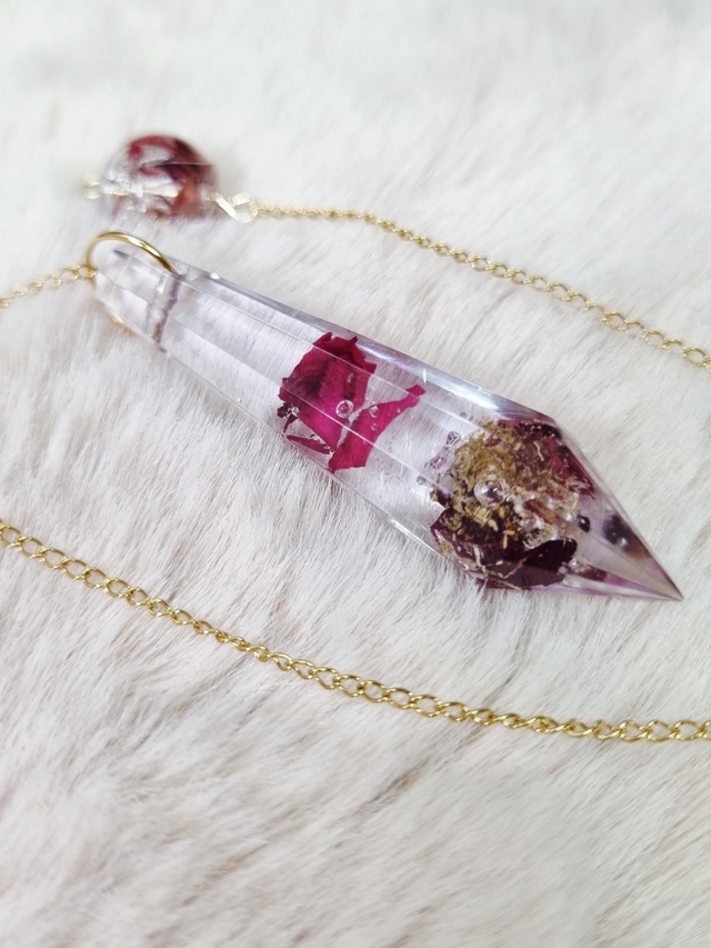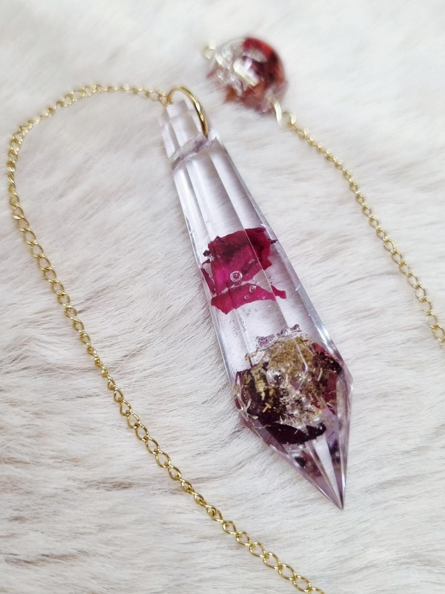 Ce Pendule contient le mélange amour de soi : rose et camomille. La rose symbolise l'amour tandis que la camomille symbolise le calme et l'idée de penser à soi.