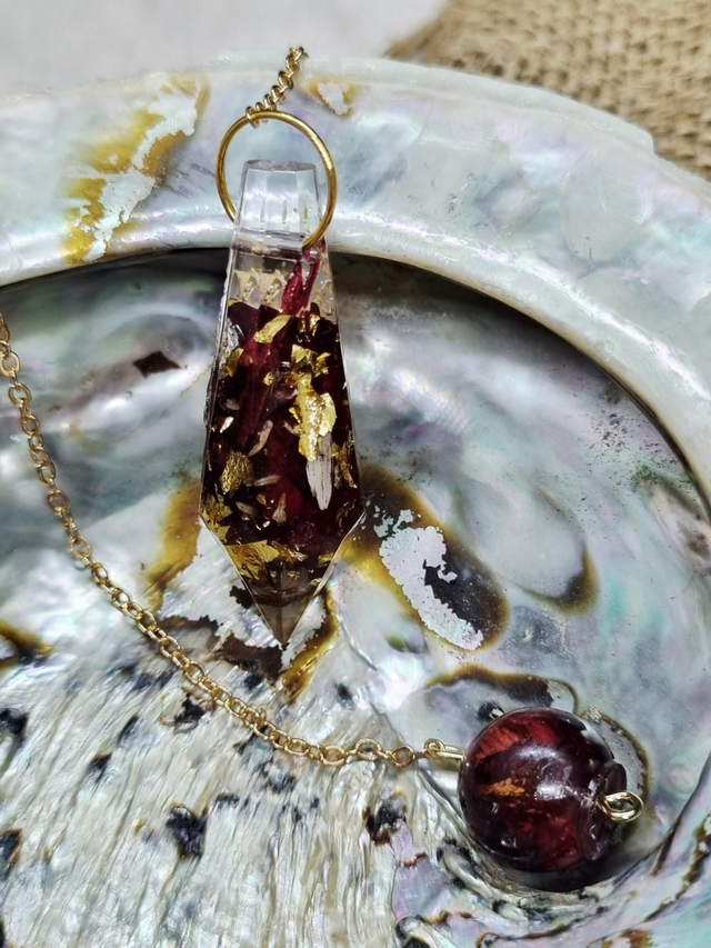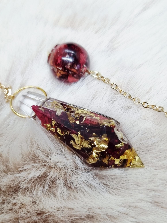 Ce Pendule contient le mélange amour de soi : rose et camomille. La rose symbolise l'amour tandis que la camomille symbolise le calme et l'idée de penser à soi. Ce modèle contient de la feuille de métal doré.