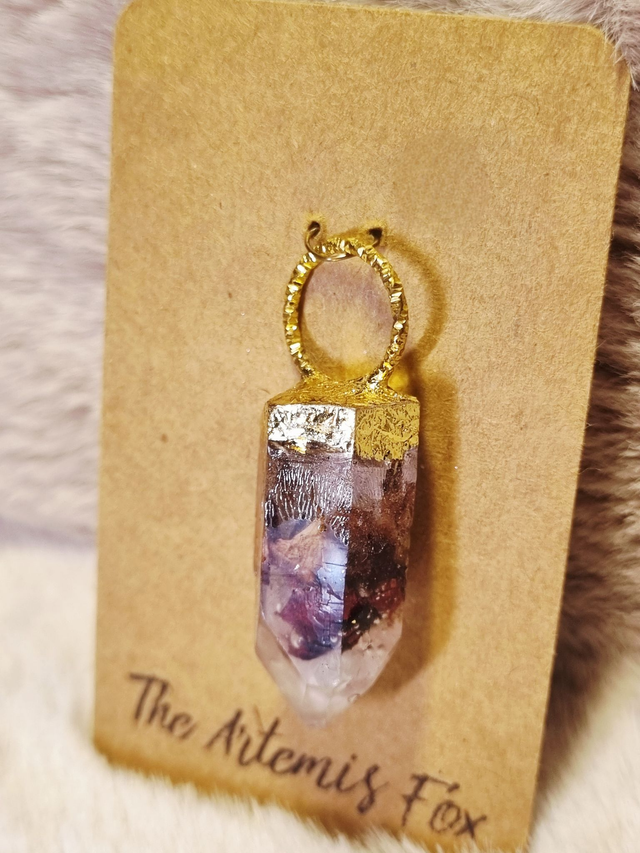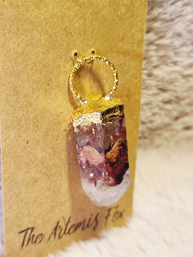 Le Pendentif en forme de Cristal de The Artemis Fox est réalisé à partir de véritables cristaux de roche qui ont été utilisés pour creer un moule en silicone, reproduisant les plus fines aspérités du Cristal. Il est surmonté d'un anneau en fer (protection) et recouvert en partie de feuille de métal doré.