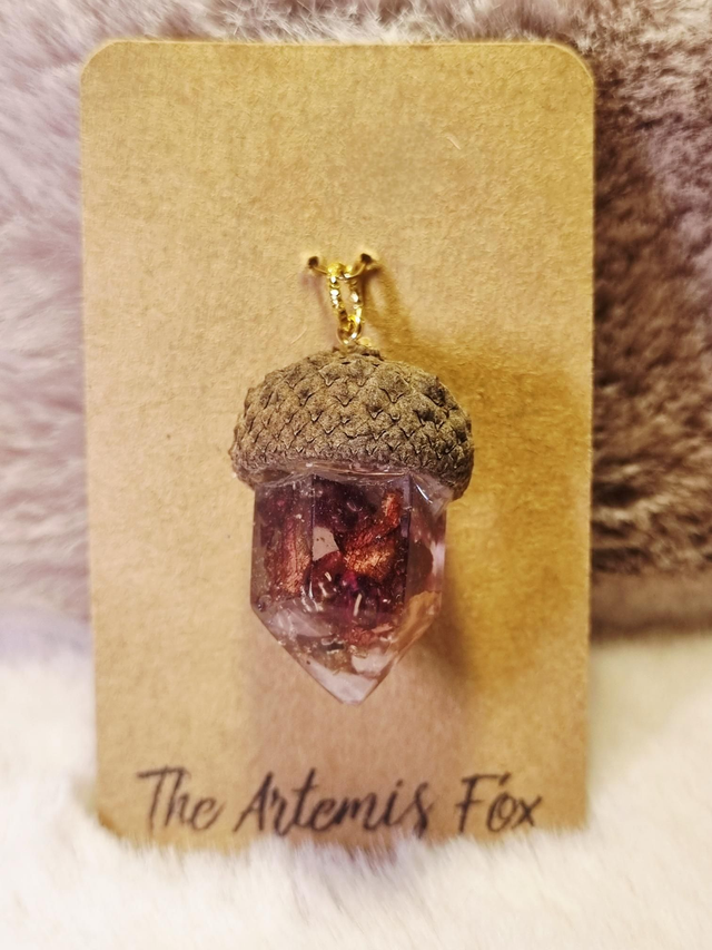 Parce que oui, c'est bien une véritable cupule de gland qui orne ce talisman en forme de cristal ! Le cristal en résine contient le mélange de l'Amour de Soi, rose et camomille, avec quelques petits quartz roses dans le fond.