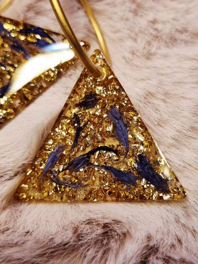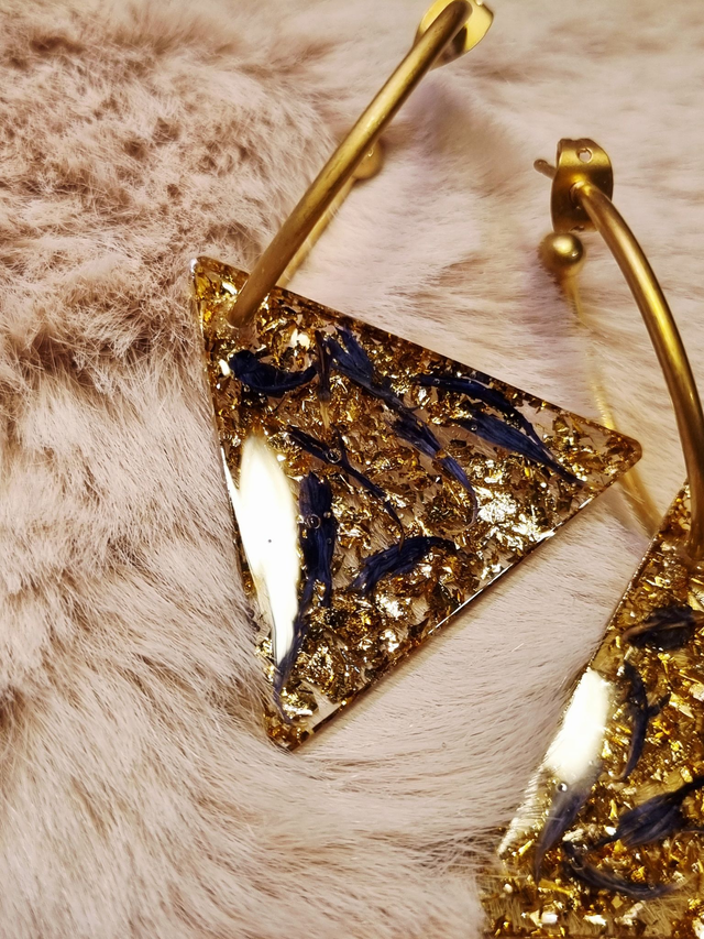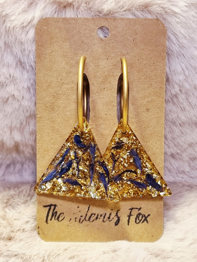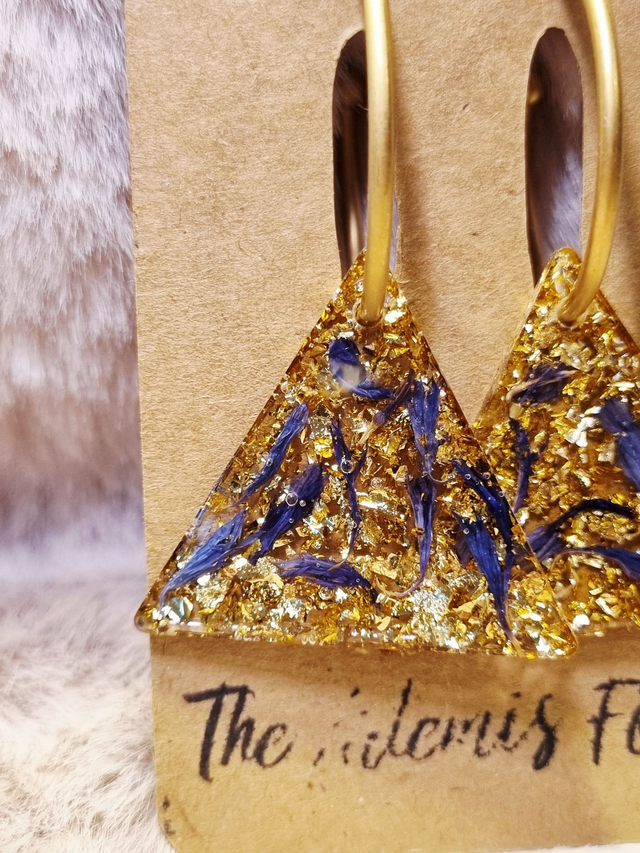 Ces ravissantes boucles d'oreilles contiennent du bleuet, symbole de force, de délicatesse et de bienveillance. De la feuille de métal doré tapisse le fond.