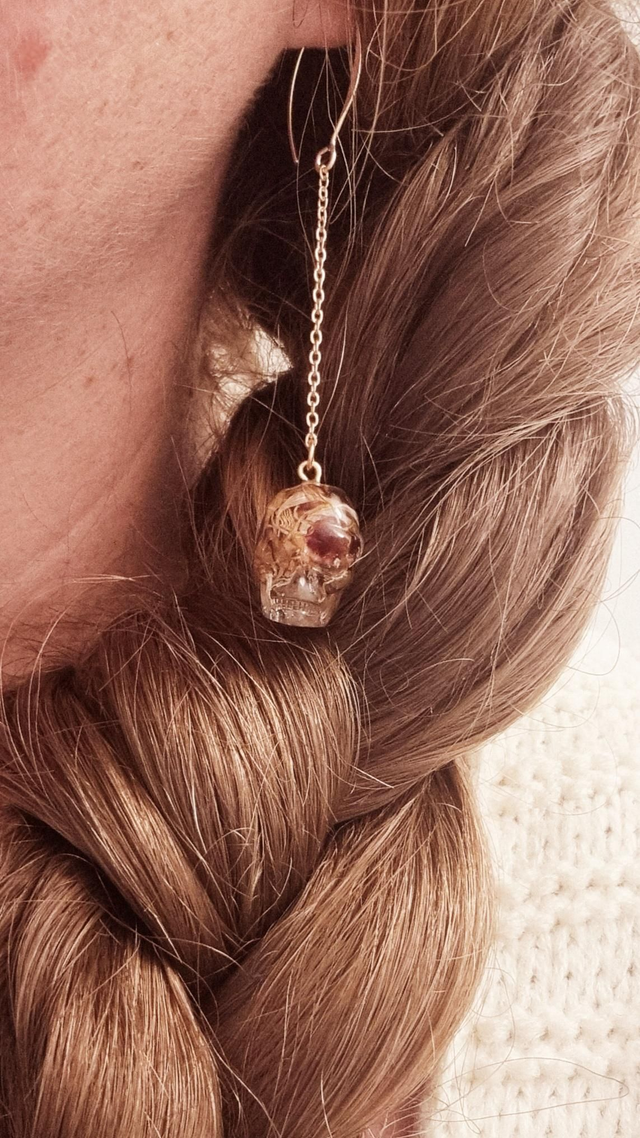 Boucles d'oreilles longues avec talismans en forme de petit crâne contenant le Mélange des ancêtres