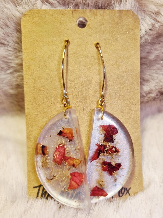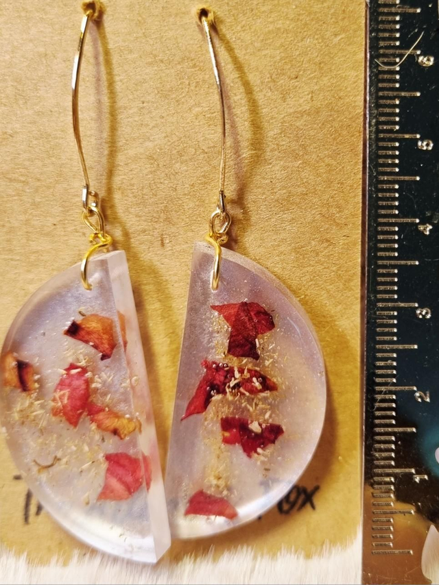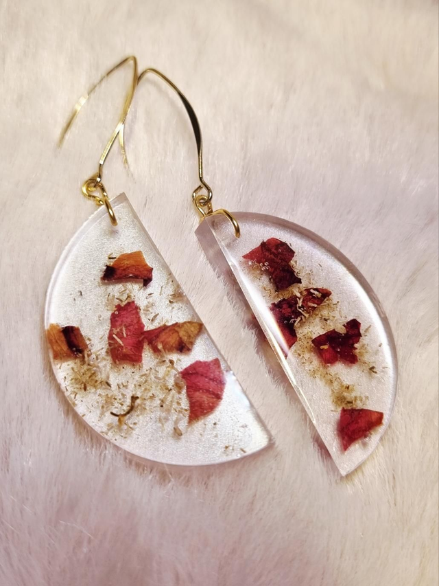 Boucles d'oreilles en résine UV-led, contenant de la rose et de la camomille, apprêts en laiton doré, forme en quartier de lune ou demi-cercle