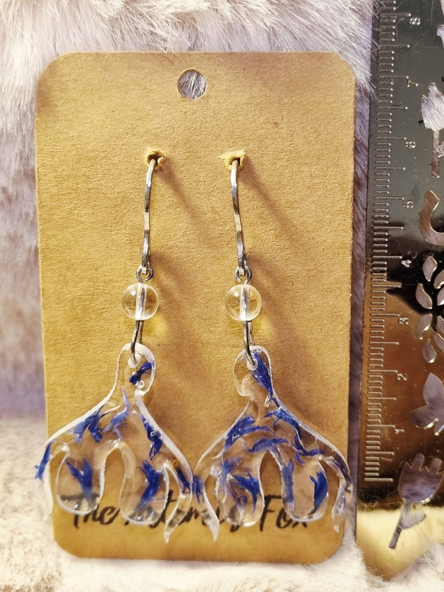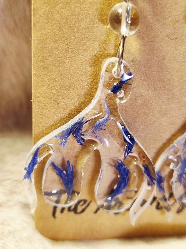 Boucles d'oreilles en résine UV-led, contenant du bleuet, apprêts en acier inox
