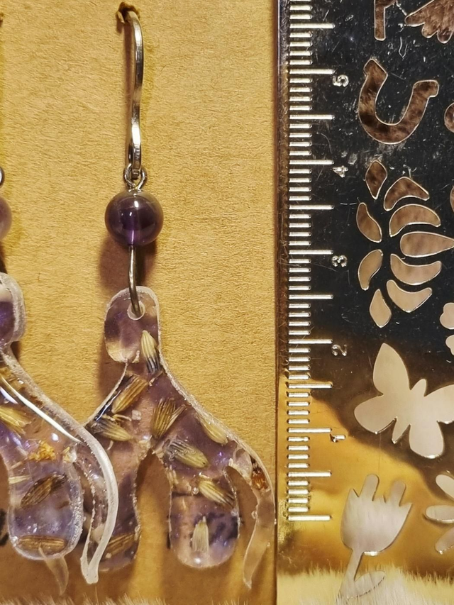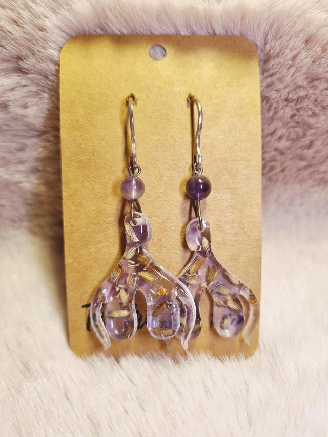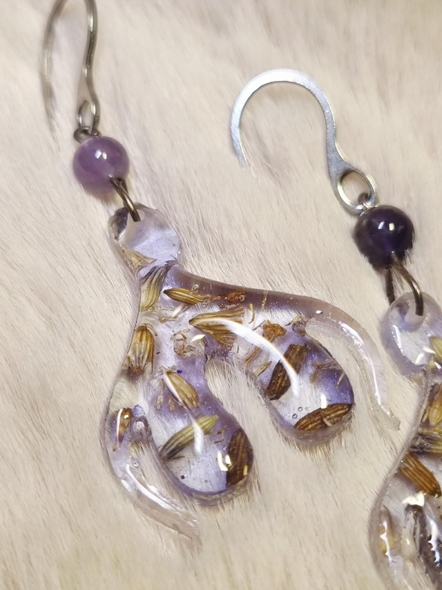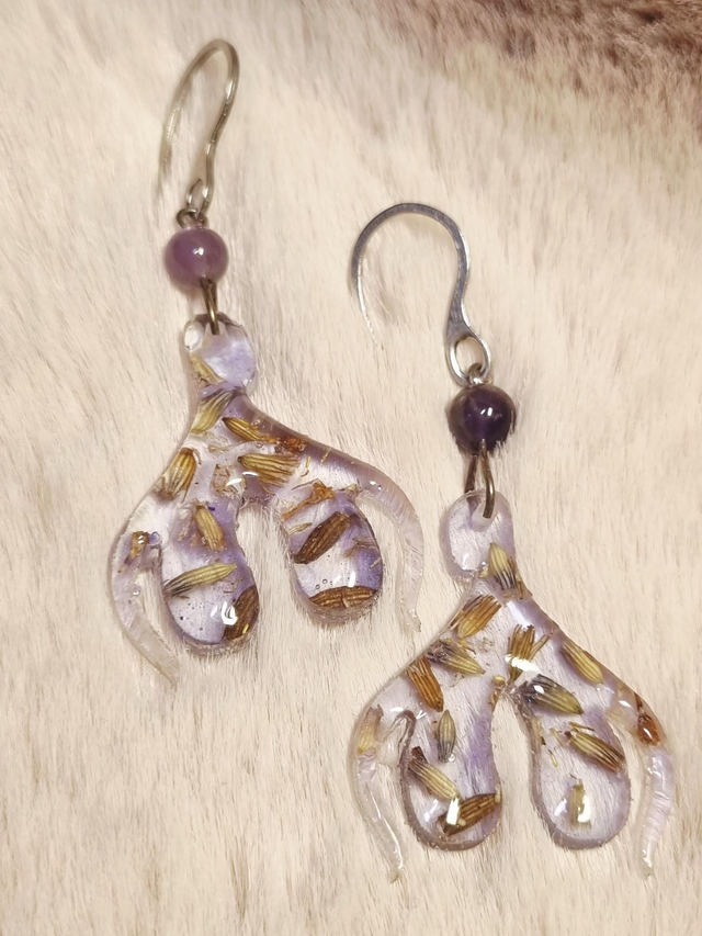 Ces scandaleuses boucles d'oreilles contiennent de la lavande et de la camomille qui ensemble, symbolisent la sérénité. Chaque clit' est surmonté d'une perle d'améthyste pour encore plus d'apaisement