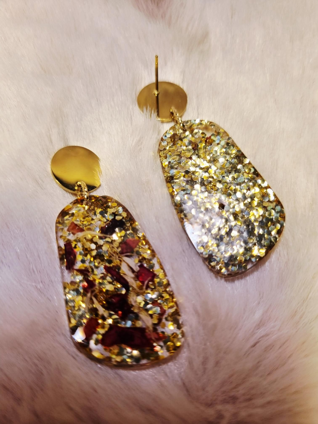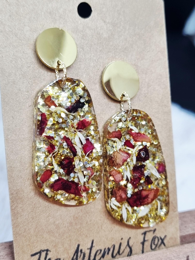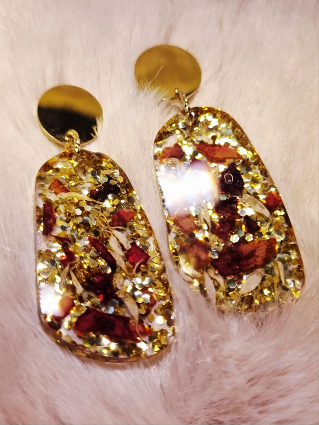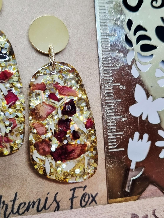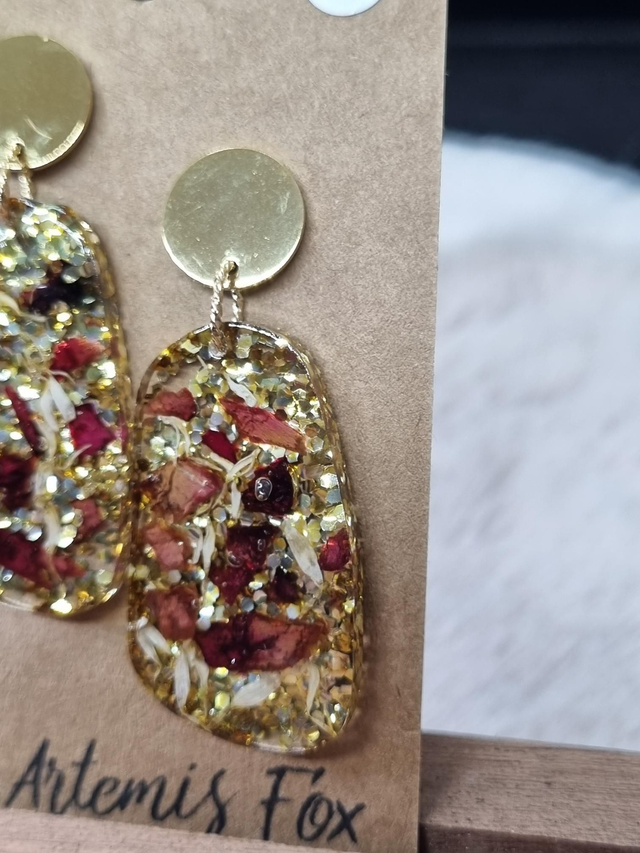 Ces ravissantes boucles d'oreilles contiennent le mélange hautement symbolique de l'amour de soi : rose et camomille. La rose symbolise l'amour tandis que la camomille symbolise le calme et l'idée de penser à soi. Petite coquetterie supplémentaire, ce modèle contient PLEIN de paillettes dorées (The Artemis Fox aime ce qui brille et décrète que les paillettes c'est tous les jours)
